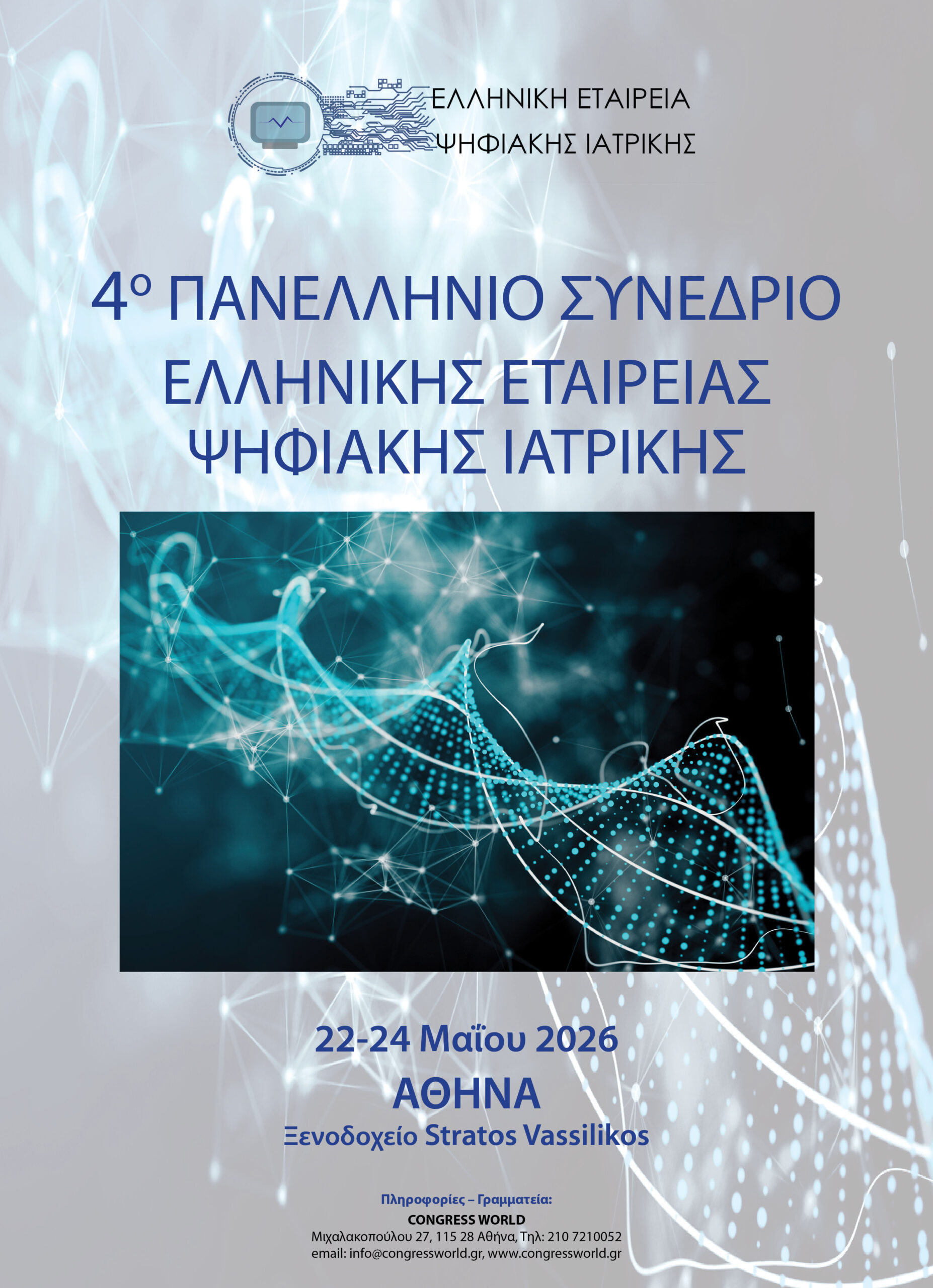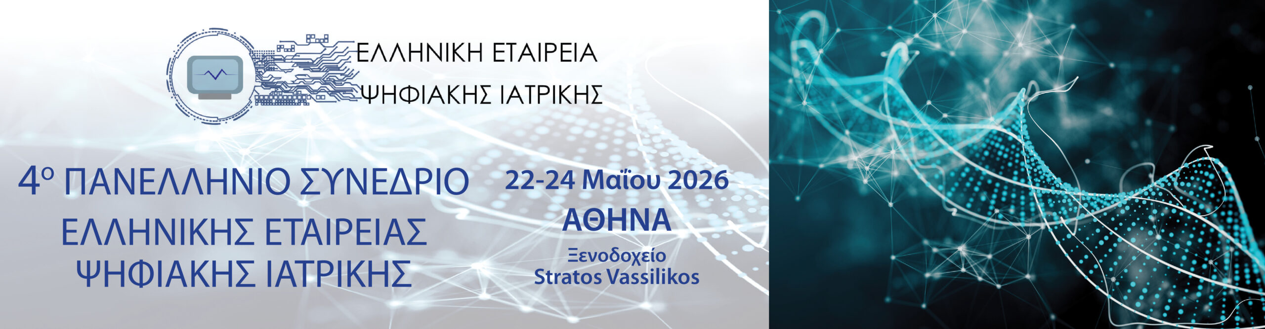 Με ιδιαίτερη χαρά αναγγέλουμε το 4ο Πανελλήνιο Συνέδριο Ψηφιακών Εφαρμογών στην Ιατρική, το οποίο θα πραγματοποιηθεί στην Αθήνα, στο ξενοδοχείο STRATOS VASSILIKOS, στις 22 - 24 Μαΐου 2026.